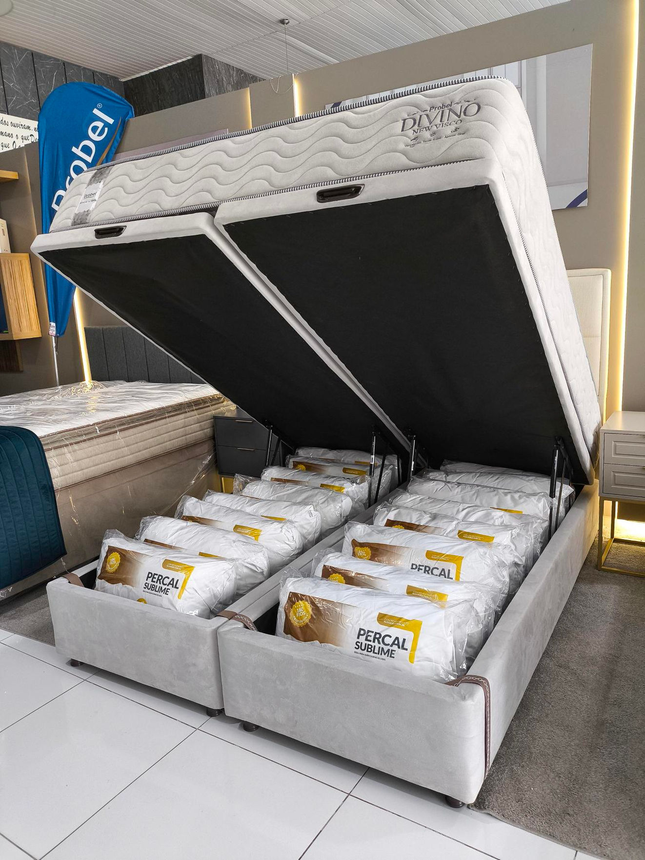 Possui sistema de abertura e fechamento com pistões pneumáticos (amortecedores) que facilitam o manuseio. Sua tampa se mantém aberta sem a necessidade de segurar, deixando um espaço livre entre a estrutura da cama para guardar e organizar objetos.